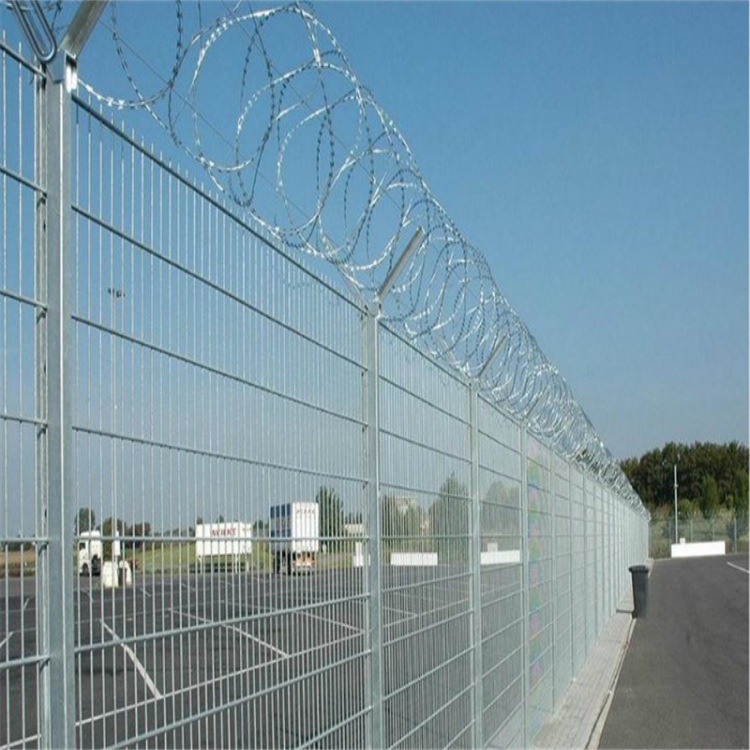 在结构设计上,机场护栏网通常采用Y型支架立柱与加强型焊接片网的组合形式。立柱多为60×60毫米矩形钢,顶端设置Y型支架;网片则采用直径4.0-5.0毫米的低碳钢丝焊接而成,网孔规格常见为50×100毫米或50×200毫米。网片中带有V型加强筋,这一设计有助于提升网面整体强度,使其能够承受一定程度的冲击。根据民航标准要求,飞行区围栏净高度不低于2.5米,竖筋间距不大于100毫米,立柱间距不超过3米,这些尺寸规定为平衡防护效果与视觉通透性提供了依据。